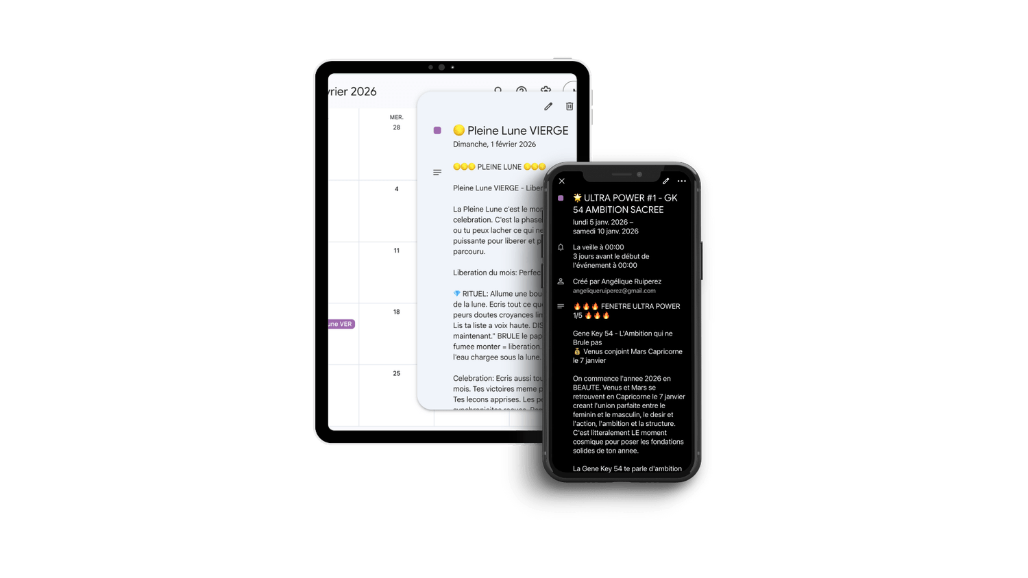 Tu kiffes l'idée d'avoir un calendrier où TOUT est déjà calculé pour toi - transits, lunes, mercure rétro, dates optimales